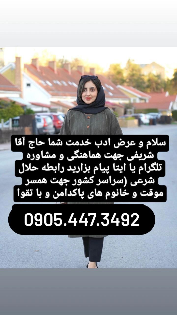 سلام حاج اقا محمدی هستم مورد خانم پاکدامن و با تقوا مطلقه بیشتر شهرها دارم با موسسه معتبر جهت مشاهده خانم ها و هماهنگی به ایتا یا تلکرام واتساپ به شماره 09054473492پیام دهید التماس دعا