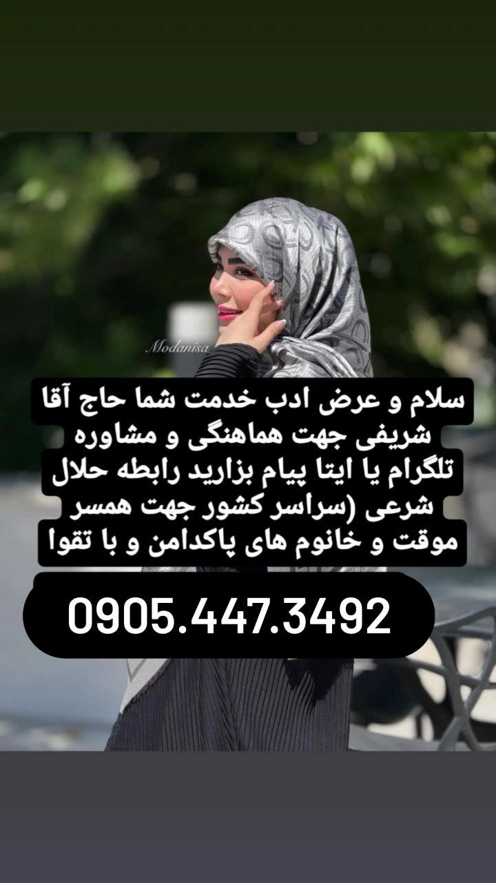 سلام حاج اقا محمدی هستم مورد خانم پاکدامن و با تقوا مطلقه بیشتر شهرها دارم با موسسه معتبر جهت مشاهده خانم ها و هماهنگی به ایتا یا تلکرام واتساپ به شماره 09054473492پیام دهید التماس دعا